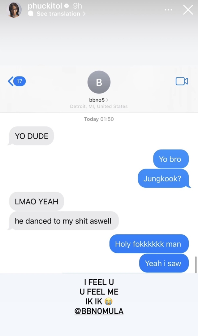 พร้อมกันนี้ มิลลิ ยังได้โพสต์ไอจีสตอรี่ที่ "bbno$" (เบบี้ โน มันนี่) แร็ปเปอร์ชาวแคนาดาได้ทักมาหา เพราะก่อนหน้านี้จองกุกก็เต้นเพลงของอีกฝ่ายด้วยเช่นกัน