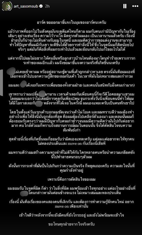 ผมยอมรับในจุดที่ผิด ก็ด่า ว่าในสิ่งที่ผิด ผมพร้อมเข้าใจทุกอย่าง แต่อะไรอย่างอื่น อ. โดนกล่าวหามันค่อนข้างจะแรง ไม่เหมาะสมและหลงประเด็นเรื่องนี้ มันคือเรื่องของคนสองคนที่เลิกกัน และต้องการทำความรู้จักคน ใหม่ อยาก move on เพียงเท่านั้น เข้าใจดีว่าหลังจากนี้จะยังมีคนที่ยังโกรธอยู่ และยังไม่พร้อมจะเข้าใจ ขอโทษทุกฝ่ายจากใจจริงครับ"