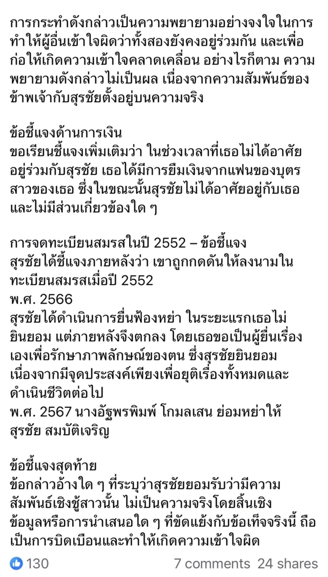 ข้อชี้แจงสุดท้าย : ข้อกล่าวอ้างใด ๆ ที่ระบุว่าสุรชัยยอมรับว่ามีความสัมพันธ์เชิงชู้สาวนั้น ไม่เป็นความจริงโดยสิ้นเชิง ข้อมูลหรือการนำเสนอใด ๆ ที่ขัดแย้งกับข้อเท็จจริงนี้ ถือเป็นการบิดเบือนและทำให้เกิดความเข้าใจผิด