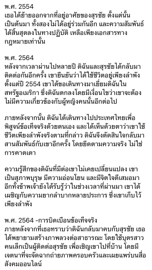 - พ.ศ. 2564 -การบิดเบือนข้อเท็จจริง : ภายหลังจากที่เธอทราบว่าดิฉันกลับมาคบกับสุรชัย เธอได้พยายามสร้างภาพลวงต่อสาธารณะ โดยใช้บุตรสาวคนเล็กเป็นผู้ติดต่อสุรชัย เพื่อเชิญเขาไปที่บ้าน โดยมีเจตนาที่จะจัดฉากถ่ายภาพครอบครัวและเผยแพร่บนสื่อสังคมออนไลน์ การกระทำดังกล่าวเป็นความพยายามอย่างจงใจในการทำให้ผู้อื่นเข้าใจผิดว่าทั้งสองยังคงอยู่ร่วมกัน และเพื่อก่อให้เกิดความเข้าใจคลาดเคลื่อน อย่างไรก็ตาม ความพยายามดังกล่าวไม่เป็นผล เนื่องจากความสัมพันธ์ของข้าพเจ้ากับสุรชัยตั้งอยู่บนความจริง