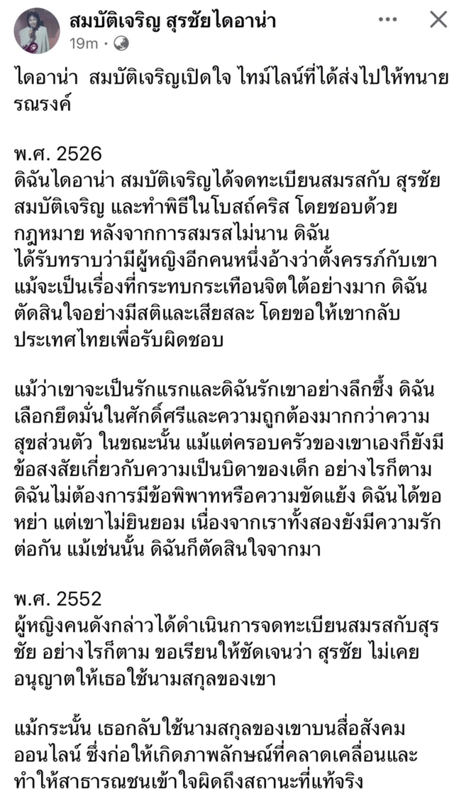 โดย "ไดอาน่า สมบัติเจริญ" ภรรยาของ สุรชัย ได้โพสต์ไทม์ไลน์เรื่องราวในฝั่งของตนเองเป็นครั้งแรก ระบุแคปชั่นว่า "ไดอาน่า สมบัติเจริญเปิดใจ ไทม์ไลน์ที่ได้ส่งไปให้ทนายรณรงค์ "
