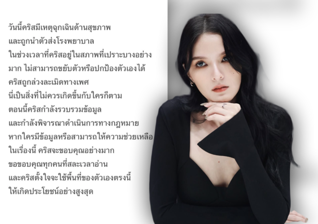 โดยระบุข้อความว่า "วันนี้คริสมีเหตุฉุกเฉินด้านสุขภาพ และถูกนําตัวส่งโรงพยาบาล ในช่วงเวลาที่คริสอยู่ในสภาพที่เปราะบางอย่างมาก ไม่สามารถขยับตัวหรือปกป้องตัวเองได้ คริสถูกล่วงละเมิดทางเพศ นี่เป็นสิ่งที่ไม่ควรเกิดขึ้นกับใครก็ตาม ตอนนี้คริสกําลังรวบรวมข้อมูล และกําลังพิจารณาดำเนินการทางกฎหมาย หากใครมีข้อมูลหรือสามารถให้ความช่วยเหลือ ในเรื่องนี้ คริสจะขอบคุณอย่างมาก ขอขอบคุณทุกคนที่สละเวลาอ่าน และคริสตั้งใจจะใช้พื้นที่ของตัวเองตรงนี้ ให้เกิดประโยชน์อย่างสูงสุด"