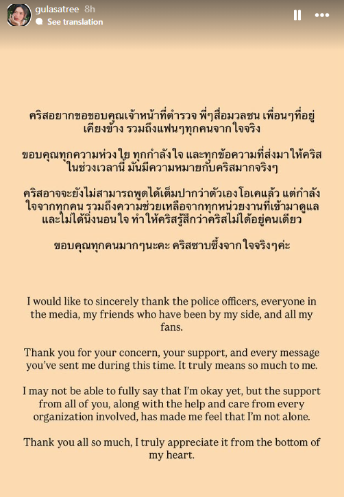 ล่าสุด "คริสติน กุลสตรี มิชารัลสกี้" โพสต์ไอจีสตอรี่ว่า "คริสอยากขอขอบคุณเจ้าหน้าที่ตำรวจ พี่ๆ สื่อมวลชน เพื่อนๆ ที่อยู่เคียงข้าง รวมถึงแฟนๆ ทุกคนจากใจจริง ขอบคุณทุกความห่วงใย ทุกกำลังใจ และทุกข้อความที่ส่งมาให้คริสในช่วงเวลานี้ มันมีความหมายกับคริสมากจริงๆ คริสอาจจะยังไม่สามารถพูดได้เต็มปากว่าตัวเองโอเคแล้ว แต่กำลังใจจากทุกคน รวมถึงความช่วยเหลือจากทุกหน่วยงานที่เข้ามาดูแล และไม่ได้นิ่งนอนใจ ทำให้คริสรู้สึกว่า คริสไม่ได้อยู่คนเดียว ขอบคุณทุกคนมากๆ นะคะ คริสซาบซึ้งใจจริงๆ ค่ะ"