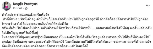 ก่อนจะตามมาด้วยโพสต์ที่ว่า "ทำไมอ่ะ ความแตกแล้วมารับเร็วจัง ทำดีดีหน่อย วันที่เค้าอยู่เค้ามีบ้านก็ เอาเค้ากลับบ้านให้มันถูกต้องถูกวิธี ถ้ากลัวก็ลอยอังคารทำให้มันถูกต้องใครจะว่าเราได้ ไม่อยากเอากลับบ้านก็ติดต่อที่วัด สร้างที่เก็บ ไม่ใช่เอาไปฝาก..แล้วเค้าวางไว้ตรงไหนก็วางไว้ตรงนั้น … ก่อนตายเพิ่งจะได้มีที่อยู่ พอสิ้นแล้ว กลับไปเป็นวิญญาณที่ไม่มีที่อยู่