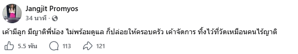 ขณะที่ "แจง ปุณณาสา พรหมยศ" ภรรยา "แจ๊ส ชวนชื่น" ได้โพสต์ข้อความผ่านเฟซบุ๊กเพจ ระบุว่า "เค้ามีลูก มีญาติพี่น้อง ไม่พร้อมดูแล ก็ปล่อยให้ครอบครัว เค้าจัดการ ทิ้งไว้ที่วัดเหมือนคนไร้ญาติ"