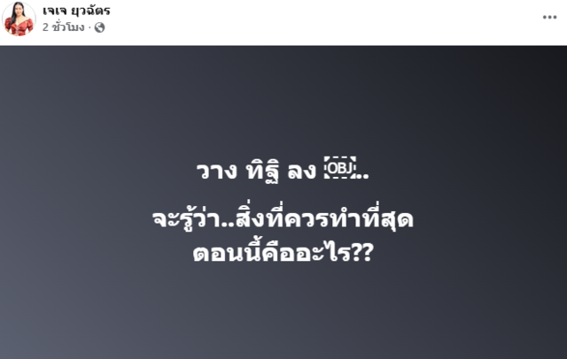 แต่ที่น่าจะจับตาคงไม่พ้น "เจเจ ยุวฉัตร" อดีตภรรยาของ เหน่ง ซึ่งได้โพสต์ข้อความว่า "วาง ทิฐิ ลง จะรู้ว่า..สิ่งที่ควรทำที่สุด ตอนนี้คืออะไร??"