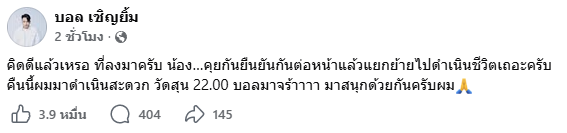 ล่าสุด ทางด้าน "บอล เชิญยิ้ม" ดาราคนดังที่ "เหน่ง เหม่งจ๋าย" เคยร่วมงานมากว่า 10 ปีได้ออกมาเคลื่อนไหวด้วยการโพสต์ข้อความผ่านบัญชีเฟซบุ๊กส่วนตัว ระบุว่า "คิดดีแล้วเหรอ ที่ลงมาครับ น้อง คุยกันยืนยันกันต่อหน้าแล้วแยกย้ายไปดำเนินชีวิตเถอะครับ คืนนี้ผมมาดำเนินสะดวก วัดสุน 22.00 บอลมาจร้าาาา มาสนุกด้วยกันครับผม"