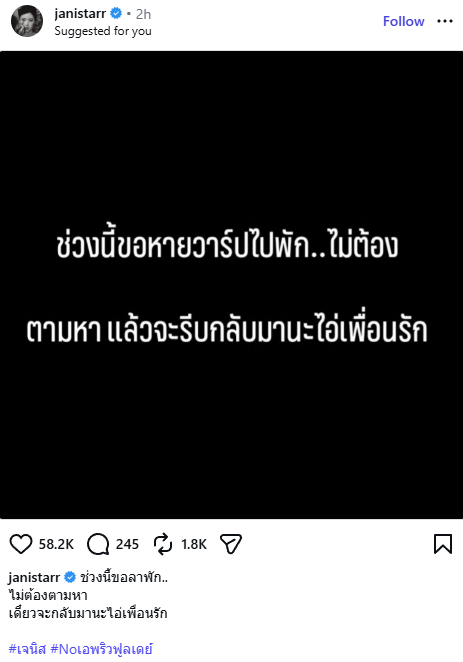 โดย เจนิส ได้โพสต์ข้อความสีดำดังกล่าวผ่านอินสตาแกรม ระบุว่า "ช่วงนี้ขอลาพัก..ไม่ต้องตามหา เดี๋ยวจะกลับมานะไอ่เพื่อนรัก #เจนิส #Noเอพริวฟูลเดย์"