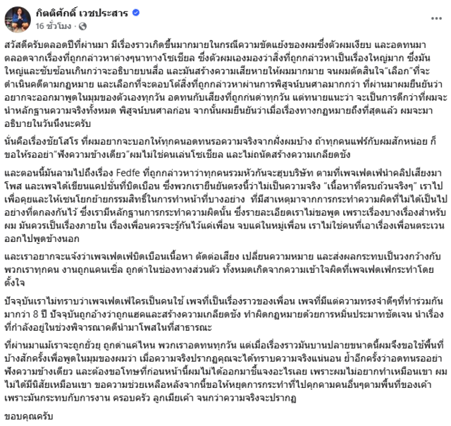 นั่นคือเรื่องชัยโสโร ที่ผมอยากจะบอกให้ทุกคนอดทนรอความจริงจากฝั่งผมบ้าง ถ้าทุกคนแฟร์กับผมสักหน่อย ก็ขอให้รออย่า ฟังความข้างเดียว ผมไม่ใช่คนเล่นโซเชียล และไม่ถนัดสร้างความเกลียดชัง และตอนนี้มันลามไปถึงเรื่อง Fedfe ที่ถูกกล่าวหาว่าทุกคนรวมหัวกันจะฮุบบริษัท ตามที่เพจเฟดเฟ่นำคลิปเสียงมาโพส และเพจได้เขียนแคปชั่นที่บิดเบือนซึ่งพวกเรายืนยันตรงนี้ว่าไม่เป็นความจริง