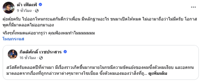 ที่ผ่านมาแม้เราจะถูกยั่วยุ ถูกด่าแค่ไหน พวกเราอดทนทุกวัน แต่เมื่อเรื่องราวมันบานปลายขนาดนี้ผมจึงขอใช้พื้นที่บ้างสักครั้งเพื่อพูดในมุมของผมว่า เมื่อความจริงปรากฏคุณจะได้ทราบความจริงแน่นอน ย้ำอีกครั้งว่าอดทนรออย่าฟังความข้างเดียว และต้องขอโทษที่ก่อนหน้านี้ผมไม่ได้ออกมาชี้แจงอะไรเลย เพราะผมไม่อยากทำเหมือนเขา ผมไม่ได้มีนิสัยเหมือนเขา ขอความช่วยเหลือหลังจากนี้ขอให้หยุดการกระทำที่ไปคุกคามคนอื่นๆตามพื้นที่ของเค้า เพราะมันกระทบกับการงาน ครอบครัว ลูกเมียเค้า จนกว่าความจริงจะปรากฏ ขอบคุณครับ"