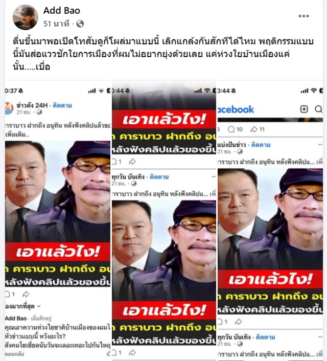 น้าแอ๊ดได้ระบุข้อความในโพสต์ดังกล่าวว่า "ตื่นขึ้นมาพอเปิดโทรศัพท์ดูก็โผล่มาแบบนี้ เลิกแกล้งกันสักทีได้ไหม พฤติกรรมแบบนี้มันส่อแววชักใยการเมืองที่ผมไม่อยากยุ่งด้วยเลย แค่ห่วงใยบ้านเมืองเท่านั้น.....เบื่อ"