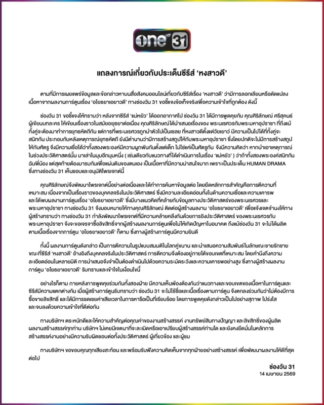 ต่อมาวันที่ 14 เม.ย. 69 ช่องวัน 31 ออกแถลงการณ์เกี่ยวกับประเด็นซีรีส์ “หงสาวดี” ระบุว่า ตามที่มีการเผยแพร่ข้อมูลและข้อกล่าวหาบนสื่อสังคมออนไลน์เกี่ยวกับซีรีส์เรื่อง “หงสาวดี” ว่ามีการลอกเลียนหรือดัดแปลงเนื้อหาจากผลงานการ์ตูนเรื่อง “อโยธยาเยาวดี” ทางช่องวัน 31 ขอชี้แจงข้อเท็จจริงเพื่อความเข้าใจที่ถูกต้อง ดังนี้