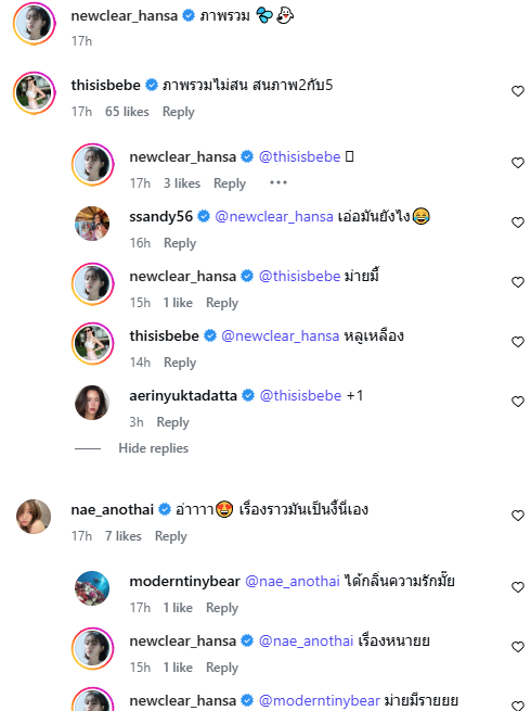 ขนาดที่เพื่อนดาราถึงกับเข้ามาแซว อาทิ "เบเบ้ ธันย์ชนก" เข้ามาคอมเมนต์ว่า "ภาพรวมไม่สน สนภาพ2กับ5" รวมถึง "แบงค์ อนุสิทธิ" ที่คอมเมนต์ว่า "เลิฟฟฟฟ แต่รูปสองยังไง ไหนเล่า 😍" พร้อมด้วย "เนะ อโณทัย" เข้ามาแซวว่า "อ่าาาา😍 เรื่องราวมันเป็นงี้นี่เอง"