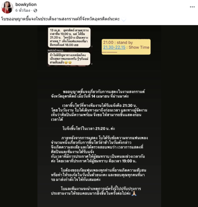 โดย โบกี้ไลอ้อน ได้โพสต์ชี้แจงว่า "โบขออนุญาตชี้แจงในประเด็นงานสงกรานต์ที่จังหวัดอุตรดิตถ์นะคะ ขออนุญาตชี้แจงเกี่ยวกับการแสดงในงานสงกรานต์ จังหวัดอุตรดิตถ์ เมื่อวันที่ 14 เมษายน ที่ผ่านมาค่ะ