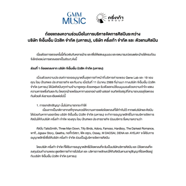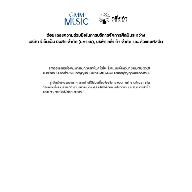 ล่าสุด เฟซบุ๊กเพจ GMM Grammy ได้โพสต์ถ้อยแถลงความร่วมมือในการบริหารจัดการศิลปินระหว่างบริษัท จีเอ็มเอ็ม มิวสิค จำกัด (มหาชน), บริษัท ครึ่งเก้า จำกัด และ ตัวแทนศิลปิน