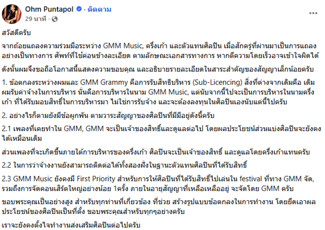 ในเวลาต่อมา "โอม Cocktail" ได้เคลื่อนไหวโพสต์ข้อความระบุว่า "สวัสดีครับ จากถ้อยแถลงความร่วมมือระหว่าง GMM Music, ครึ่งเก้า และตัวแทนศิลปิน เมื่อสักครู่ที่ผ่านมาเป็นการแถลงอย่างเป็นทางการ ศัพท์ที่ใช้ค่อนข้างละเอียด ตามลักษณะเอกสารทางการ หากตีความโดยเร็วอาจเข้าใจผิดได้