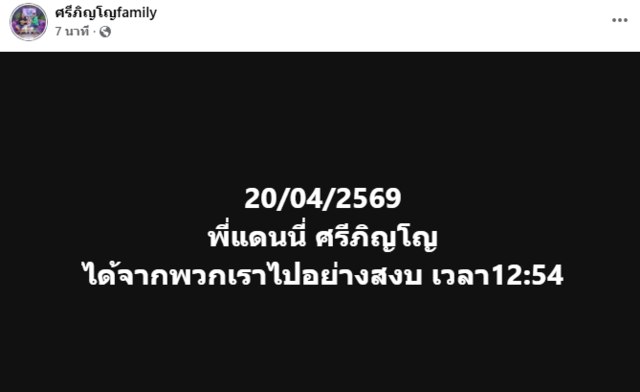 นับว่าเป็นการสูญเสียครั้งยิ่งใหญ่อีกครั้งของวงการบันเทิง เฟซบุ๊กเพจ ศรีภิญโญfamily แจ้งข่าวระบุข้อความว่า "20/04/2569 พี่แดนนี่ ศรีภิญโญ ได้จากพวกเราไปอย่างสงบ เวลา 12.54 น." ทั้งนี้มีรายงานสาเหตุว่า เสียชีวิตด้วยโรคไตวายเฉียบพลันในวัย 57 ปี