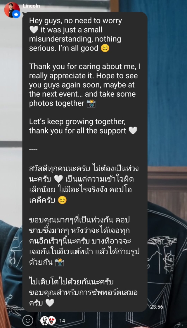 อย่างไรก็ตาม "ลินคอล์น The Face Season 4" ได้ออกมาเคลื่อนไหว เผยข้อความว่า "สวัสดีทุกคนนะครับ ไม่ต้องห่วงนะครับ เป็นแค่ความเข้าใจผิดเล็กน้อย ไม่มีอะไรจริงจัง คอปโอเคดีครับ ขอบคุณทุกคนมากๆ ที่เป็นห่วงกัน คอปซาบซึ้งมากๆ หวังว่าจะได้เจอทุกคนอีกเร็งๆ นี้นะครับ บางทีอาจจะเจอกันในอีเวนต์หน้า แล้วได้ถ่ายรูปด้วยกัน ไปเติบโตไปด้วยกันนะครับ ขอคุณสำหรับการซัพพอร์ตเสมอครับ"