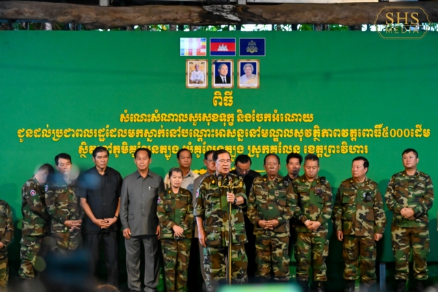 เมื่อบ่ายวันพฤหัสบดี ที่ 26 มิถุนายน 2568 สมเด็จฮุนเซน ผู้บัญชาการกองทัพบกกัมพูชาและประธานวุฒิสภาแห่งราชอาณาจักรกัมพูชา เชิญเยี่ยมชมและตรวจสอบสภาพความเป็นอยู่ชั่วคราวของพลเมืองที่อพยพโดยสมัครใจเข้าศูนย์คุ้มครองวัดป่อ 5,000 กว่าครัวเรือน ตั้งอยู่ที่หมู่บ้านกุเลน ตำบลกุเลน อำเภอกุเลน จังหวัดพระวิหาร