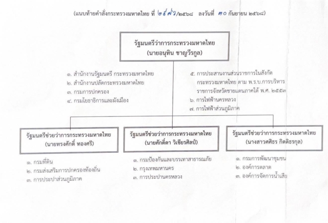 (30 ก.ย. 2568) ผู้สื่อข่าวรายงานว่า นายอนุทิน ชาญวีรกูล นายกรัฐมนตรี ในฐานะ รมว.มหาดไทย ได้ลงนามในคำสั่งกระทรวงมหาดไทย ที่2976/2568 ลงวันที่ 30 ก.ย. 2568 เรื่องการมอบหมายอำนาจหน้าที่ให้รัฐมนตรีช่วยว่าการกระทรวงมหาดไทย ปฏิบัติราชการแทนรัฐมนตรีว่าการกระทรวงมหาดไทย เพื่อแบ่งมอบภารกิจหน่วยงานในสังกัดกระทรวงมหาดไทย และรมช.มหาดไทย ทั้ง 3 คน ให้กำกับดูแล