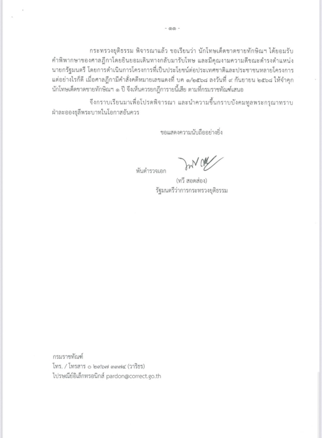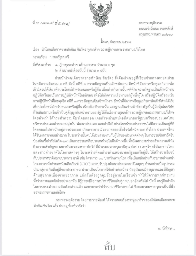 โดยมีรายละเอียดจำนวน 11หน้า และสาระสำคัญ คือ กระทรวงยุติธรรม พิจารณาแล้ว ขอเรียนว่า นักโทษเด็ดขาดชายทักษิณฯ ได้ยอมรับคำพิพากษาของศาลฎีกาโดยยินยอมเดินทางกลับมารับโทษ และมีคุณงามความดีขณะดำรงตำแหน่งนายกรัฐมนตรี โดยการดำเนินการโครงการที่เป็นประโยชน์ต่อประเทศชาติและประชาชนหลายโครงการ