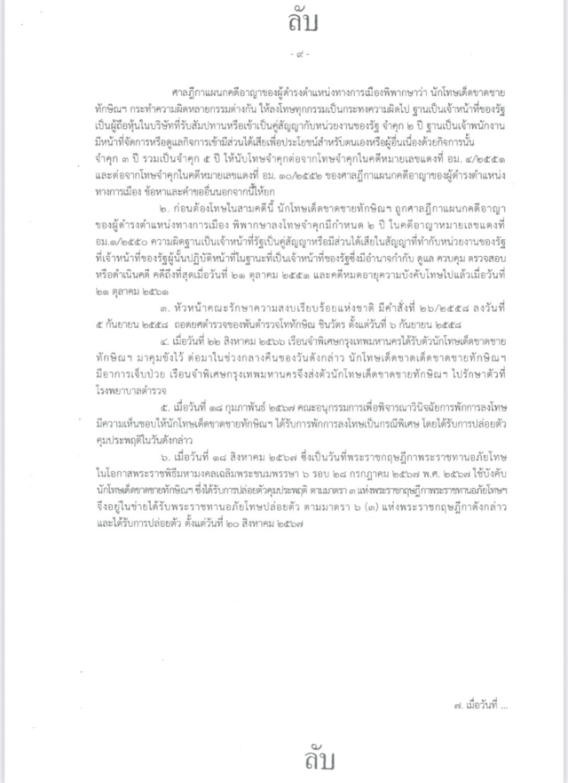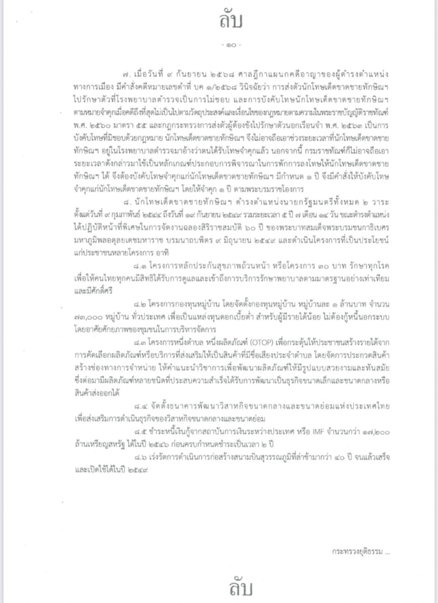 แต่อย่างไรก็ดี เมื่อศาลฎีกามีคำสั่งคดีหมายเลขแดงที่ บค 1/2568 ลงวันที่ 9 ก.ย.2568 ให้จำคุก นักโทษเด็ดขาดชายทักษิณฯ 1 ปี จึงเห็นควรยกฎีการายนี้เสีย ตามที่กรมราชทัณฑ์เสนอจึงกราบเรียนมาเพื่อโปรดพิจารณา และนำความขึ้นกราบบังคมทูลพระกรุณาทราบฝ่าละอองธุลีพระบาทในโอกาสอันควรฃ