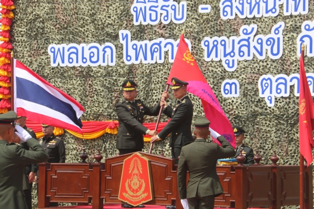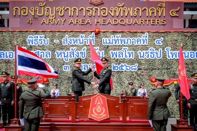 วันที่ 3 ต.ค. 68 ที่กองบัญชาการกองทัพภาคที่4 ค่ายวชิราวุธ ต.ปากพูน อ.เมือง จ.นครศรีธรรมราช พล.อ.ไพศาล หนูสังข์ ที่ปรึกษาพิเศษกองทัพบก ได้กระทำพิธีส่งมอบหน้าที่ตำแหน่ง แม่ทัพภาคที่ 4 ให้กับ พล.ท.นรธิป โพยนอก แม่ทัพภาคที่4ท่านใหม่ เพื่อส่งมอบการบังคับบัญชา ภารกิจ หน้าที่ ในการดูแลพื้นที่ภาคใต้ โดยมีนายทหารชั้นนายพลของกองทัพภาคที่ 4 ผู้บังคับหน่วยทุกระดับ และข้าราชการของกองทัพภาคที่ 4 ร่วมพิธีโดยพร้อมเพรียงกัน