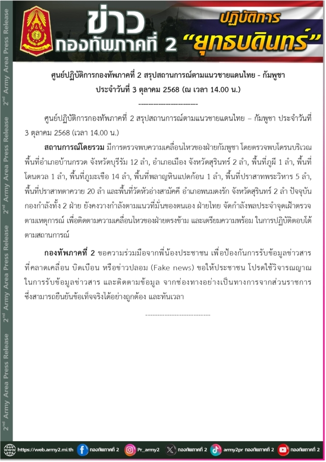 ศูนย์ปฏิบัติการกองทัพภาคที่ 2 สรุปสถานการณ์ตามแนวชายแดนไทย – กัมพูชา ประจำวันที่ 3 ตุลาคม 2568 สถานการณ์โดยรวม มีการตรวจพบความเคลื่อนไหวของฝ่ายกัมพูชา โดยตรวจพบโดรนบริเวณพื้นที่อำเภอบ้านกรวด จังหวัดบุรีรัมย์ 12 ลำ, อำเภอเมือง จังหวัดสุรินทร์ 2 ลำ, พื้นที่ภูผี 1 ลำ, พื้นที่โดนตวล 1 ลำ, พื้นที่ภูมะเขือ 14 ลำ, พื้นที่พลาญหินแปดก้อน 1 ลำ, พื้นที่ปราสาทพระวิหาร 5 ลำ, พื้นที่ปราสาทตาควาย 20 ลำ และพื้นที่วัดหัวอ่างสามัคคี อำเภอพนมดงรัก จังหวัดสุรินทร์ 2 ลำ ปัจจุบันกองกำลังทั้ง 2 ฝ่าย ยังคงวางกำลังตามแนวที่มั่นของตนเอง ฝ่ายไทย จัดกำลังพลประจำจุดเฝ้าตรวจ ตามเหตุการณ์ เพื่อติดตามความเคลื่อนไหวของฝ่ายตรงข้าม และเตรียมความพร้อม ในการปฏิบัติตอบโต้ตามสถานการณ์