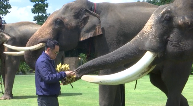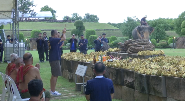 ก่อนจะเข้าสู่พิธีปะกำช้าง ซึ่งเป็นพิธีที่ตระกูลชิดชอบ ได้มีการสืบทอดมายาวนาน โดยมีคนในตระกูลชิดชอบ อย่างนายเนวิน พล.ต.อ.เพิ่มพูน นายศักดิ์สยาม ร่วมในพิธี หลังจากนั้นบรรดาผู้ร่วมงานได้นำกล้วยน้ำหว้ามาป้อนช้าง เพื่อความเป็นสิริมงคล ตามความเชื่อ
