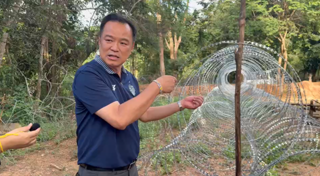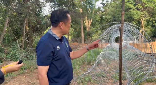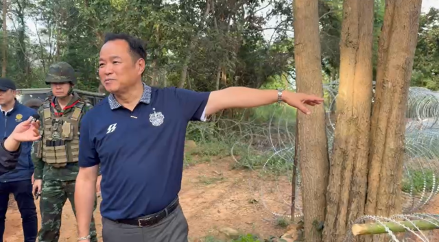 นายอนุทิน ยังพาสื่อไปชี้จุดที่เป็นรั้ววางรั้วลวดหนามซ้อนกันหลายชั้นหลายวง และวางยาวทอดไปตลอดแนวชายแดน และวันนี้ให้กำลังใจทหารตามแนวชายแดน โดยยอมรับว่า สงสารทหาร เพราะเขาต้องอยู่กันแบบนี้ ช่วงหน้าฝนก็ต้องอยู่ต้องเฝ้าตามแนวชายแดน ซึ่งนี่คือสิ่งที่จะต้องให้ความสำคัญกับทหารในช่วงนี้ หากเขาขอการสนับสนุนอะไรจากรัฐบาล เราก็ต้องดำเนินการเพราะนี่มาเห็นกับตาตัวเอง เห็นภาพว่ามีความจำเป็นอะไรบ้าง วันดีคืนดีก็มีจรวดเข้ามา ระเบิดยิงเข้ามาจากฝั่งโน้น ซึ่งนี่ถึงเรียกว่ารั้ว เราไม่ได้สร้างกำแพง และจะต้องขึ้นอยู่กับสภาพภูมิประเทศ เพราะหากสภาพภูมิประเทศแบบนี้มาสร้างกำแพงก็งบประมาณเท่าไหร่