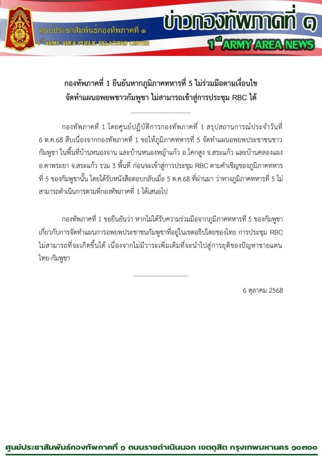 กองทัพภาคที่ 1 ศูนย์ปฏิบัติการกองทัพภาคที่ 1 สรุปสถานการณ์ประจำวันที่ 6 ต.ค.68 สืบเนื่องจากกองทัพภาคที่ 1 ขอให้ภูมิภาคทหารที่ 5 จัดทำแผนอพยพประชาชนชาวกัมพูชา ในพื้นที่บ้านหนองจาน และบ้านหนองหญ้าแก้ว อ.โคกสูง จ.สระแก้ว และบ้านคลองแผง อ.ตาพระยา จ.สระแก้ว รวม 3 พื้นที่ ก่อนจะเข้าสู่การประชุม RBC ตามคำเชิญของภูมิภาคทหารที่ 5 ของกัมพูชานั้น โดยได้รับหนังสือตอบกลับเมื่อ 5 ต.ค.68 ที่ผ่านมา ว่าทางภูมิภาคทหารที่ 5 ไม่สามารถดำเนินการตามที่กองทัพภาคทหารที่ 1 ได้เสนอไป