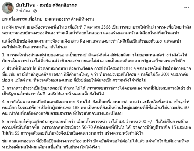 ชม คุณแพทองธาร ที่ยังมีสปิริตสู้ทางการเมือง แม้ว่า ปัจจุบันตัวเธอไปต่อไม่ได้แล้ว แต่หนักใจกับทีมงานที่จะหาประเด็นพูดให้คนกลับมาเชื่อมั่น หรือมันหาไม่ได้จริง ๆ