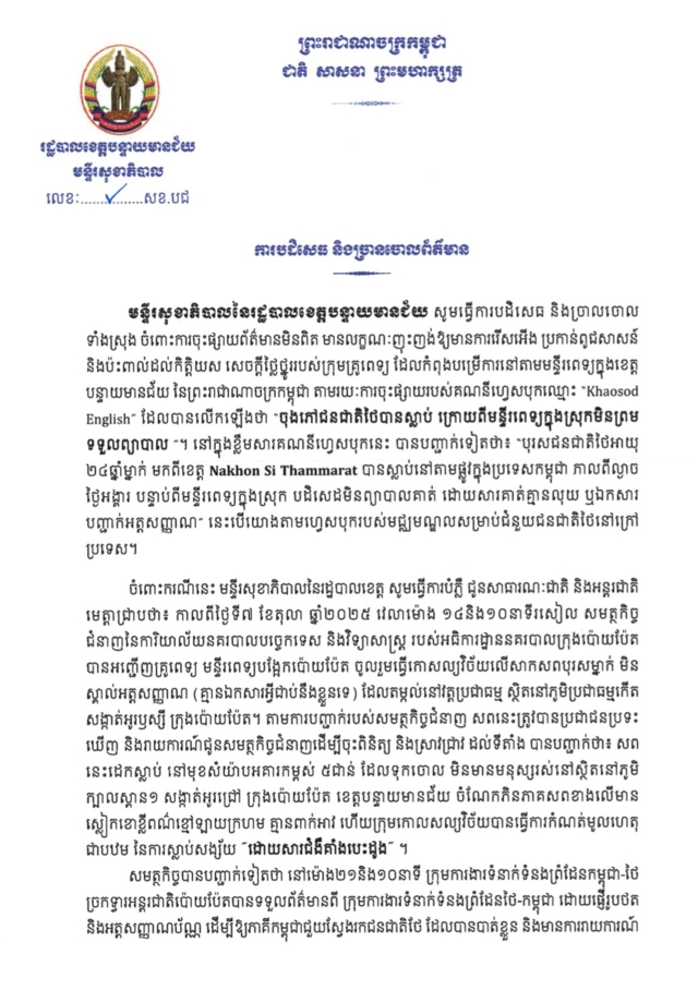 ในกรณีนี้ สำนักงานสาธารณสุขจังหวัดขอแจ้งให้สาธารณชนทั้งในประเทศและต่างประเทศทราบว่า เมื่อวันที่ 7 ตุลาคม 2568 เวลา 14.10 น. เจ้าหน้าที่และผู้เชี่ยวชาญจากสำนักงานตำรวจเทคนิคและวิทยาศาสตร์ กองบัญชาการตำรวจปอยเปต ได้เชิญแพทย์จากโรงพยาบาลส่งต่อปอยเปตเข้าร่วมการชันสูตรพลิกศพชายนิรนาม (ไม่มีเอกสารแนบ) ซึ่งถูกฝังอยู่ที่วัดพระธาตุธรรมาราม บ้านพระธาตุธรรมาราม สังกัท โอรสเสวี เมืองปอยเปต เจ้าหน้าที่ ระบุว่าประชาชนพบศพและรายงานให้เจ้าหน้าที่ตรวจสอบและสอบสวน สถานที่เกิดเหตุได้รับการยืนยันว่า ศพนอนเสียชีวิตอยู่หน้าหลังคาอาคาร 5 ชั้นที่ถูกทิ้งร้างและไม่มีใครอยู่อาศัย ในบ้านกบาลสะเปียน 1 สังกัท โอรสเสวี เมืองปอยเปต จังหวัดบันเตียเมียนเจย ศพสวมกางเกงขาสั้นสีดำมีแถบสีแดง และไม่สวมเสื้อ ทีมชันสูตรพลิกศพ ระบุว่าสาเหตุการเสียชีวิตเบื้องต้นคาดว่าเกิดจากอาการหัวใจวาย