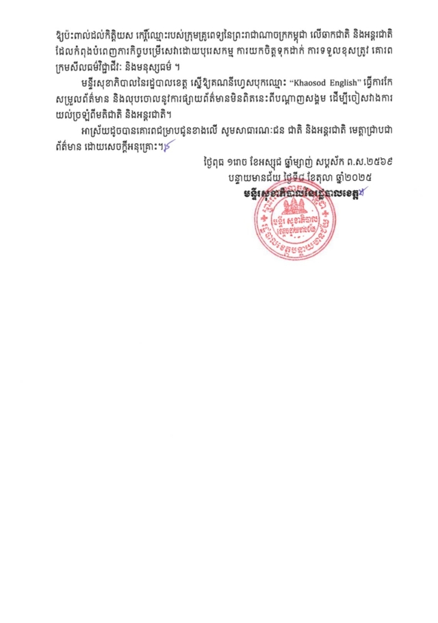 สมเด็จอัครมหาเสนาบดีเดโช ฮุน เซน ประธานวุฒิสภาแห่งราชอาณาจักรกัมพูชา ได้โพสต์เฟซบุ๊ก พร้อมแนบเอกสาร กรมอนามัย องค์การบริหารส่วนจังหวัดบันเตียเมียนเจย ขอปฏิเสธและปฏิเสธการเผยแพร่ข้อมูลอันเป็นเท็จที่ยุยงให้เกิดการเลือกปฏิบัติ การเหยียดเชื้อชาติ และการดูหมิ่นเกียรติศักดิ์ของแพทย์ประจำโรงพยาบาลในจังหวัดบันเตียเมียนเจย ราชอาณาจักรกัมพูชา ผ่านทางเฟซบุ๊ก “Khaosod English” ที่โพสต์ข้อความว่า “พ่อครัวไทยเสียชีวิตหลังโรงพยาบาลปฏิเสธการรักษา” เฟซบุ๊กของศูนย์ช่วยเหลือคนไทยในต่างแดน ระบุเพิ่มเติมว่า “ชายไทยอายุ 24 ปี จากจังหวัดนครศรีธรรมราช เสียชีวิตบนท้องถนนในประเทศกัมพูชาเมื่อเย็นวันอังคาร หลังจากโรงพยาบาลปฏิเสธการรักษา เนื่องจากไม่มีเงินหรือเอกสารยืนยันตัวตน”