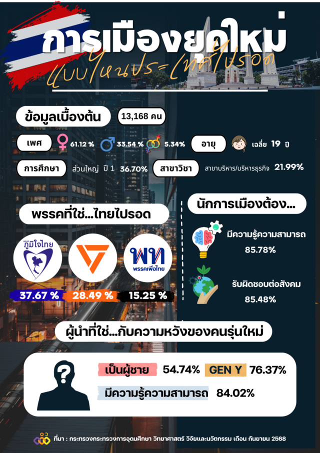 วันที่ 8 ต.ค. 68 กระทรวงการอุดมศึกษา วิทยาศาสตร์ วิจัยและนวัตกรรม เปิดเผยผลสำรวจ ช่วงเดือน ก.ย. 2568 ในประเด็นความคิดเห็นของนิสิต/นักศึกษาระดับปริญญาตรี ในประเด็น “การเมืองยุคใหม่: แบบไหนประเทศไปรอด?” โดยเก็บข้อมูลจากมหาวิทยาลัยทั่วประเทศ รวมจำนวน 13,168 คน พบว่า