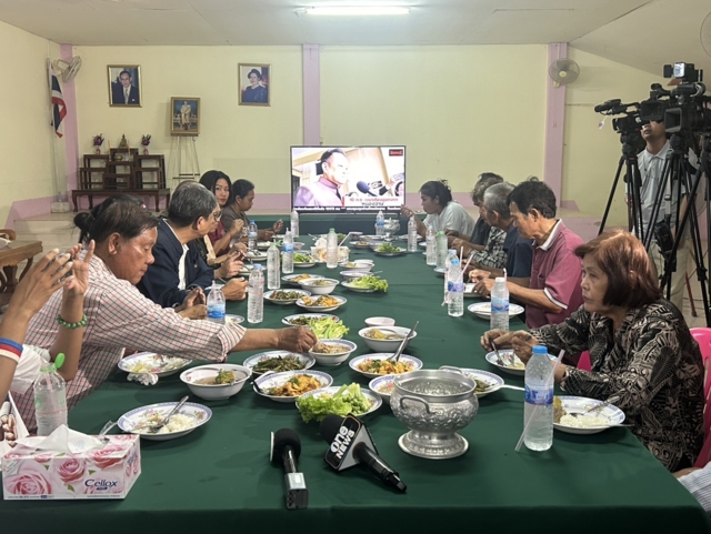 โดยก่อนทุกคนรับประทานอาหารเย็นร่วมกัน มีตัวแทนชาวบ้านได้หันไปถามกับผู้ว่าฯ สระแก้ว ว่า “จะไม่ยอมเสียดินแดนใช่หรือไม่” ซึ่งผู้ว่าหันมาตอบในทันทีว่า “ใครจะยอมเสีย” ด้านชาวบ้านถามกลับว่า "ไม่ใช่วันนี้อย่างพรุ่งนี้อย่าง" หลังจากนั้นมีการพูดคุยชวนให้ทานอาหารร่วมกันอย่างชื่นมื่น พร้อมกับมีการให้ดูคลิปการให้สัมภาษณ์ของนายกรัฐมนตรีเกี่ยวกับมาตรการผลักดันชาวกัมพูชา ออกจากบ้านหนองจาน ซึ่งเป็นแผ่นดินไทย