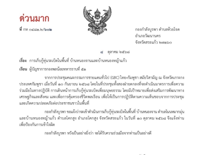 เมื่อช่วงค่ำที่ผ่านมา มีภาพเอกสาร “ด่วนมาก” ของกองกำลังบูรพา ลงวันที่ 8 ตุลาคม 2568 เรื่องการเก็บกู้ทุ่นระเบิดในพื้นที่ บ้านหนองจานและบ้านหนองหญ้าแก้ว โดยมีการส่งหนังสือถึง ผู้บัญชาการกองพลน้อยทหารราบที่ 11 ว่า