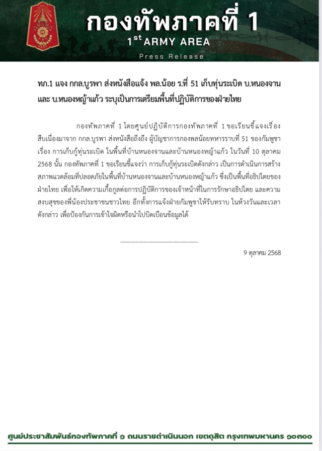 วันที่ 9 ต.ค. 68 กองทัพภาคที่1 โดยศูนย์ปฏิบัติการกองทัพภาคที่ 1 ออกเอกสารข่าวชี้แจงเรื่อง ที่กองกำลังบูรพา (กกล.บูรพา) ส่งหนังสือถึง ผู้บัญชาการกองพลน้อยทหารราบที่ 51 ของกัมพูชา เรื่องการเก็บกู้ทุ่นระเบิด ในพื้นที่บ้านหนองจานและบ้านหนองหญ้าแก้ว ในวันที่ 10 ต.ค. 68 นั้น