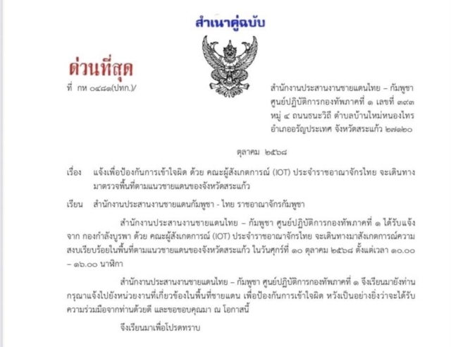 (9 ต.ค.68) สำนักงานประสานงานชายแดนไทย-กัมพูชา ศูนย์ปฏิบัติการกองทัพภาคที่ 1 มีหนังสือถึง สำนักงานประสานงานชายแดนกัมพูชา – ไทย ราชอาณาจักรกัมพูชา เรื่อง แจ้งเพื่อป้องกันการเข้าใจผิด ด้วย คณะผู้สังเกตการณ์ (IOT) ประจำราชอาณาจักรไทย จะเดินทางมาตรวจพื้นที่ตามแนวชายแดนของจังหวัดสระแก้ว