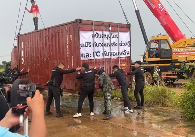 ซึ่งเมื่อช่วงเช้าได้นำตู้คอนเทนเนอร์จำนวนหนึ่งไปวางในฐานปฏิบัติการลับเรียบร้อยแล้ว จำนวน 39 ตู้ แบ่งเป็นฐานปฏิบัติการลับ 34 ตู้และแสดงออกเชิงสัญลักษณ์ที่บ้านหนองจาน 5 ตู้ โดย 5 ตู้ นี้เมื่อเสร็จภารกิจเชิงสัญลักษณ์แล้วก็จะนำไปใช้ในภารกิจทางการทหารต่อ