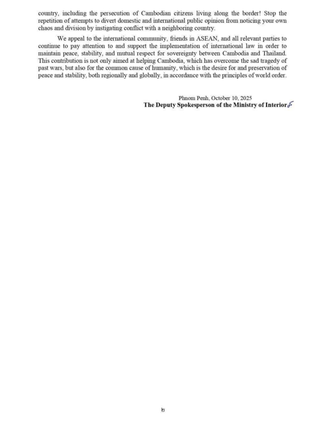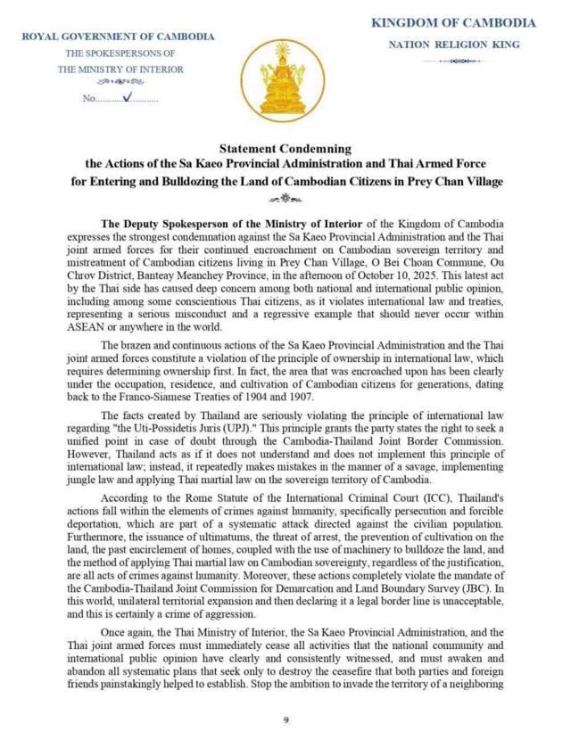 สมเด็จฮุนเซน ได้โพสต์ข้อความ แถลงการณ์ประณามการกระทำของจังหวัดสระแก้วและกองทัพไทยที่บุกรุกและทำลายที่ดินของชาวบ้านชาวกัมพูชาที่หมู่บ้านเปรยจัน โดยมีข้อความว่า รองโฆษกกระทรวงมหาดไทยแห่งราชอาณาจักรกัมพูชา แสดงความประณามอย่างรุนแรงต่อองค์การบริหารส่วนจังหวัดสระแก้วและกองกำลังร่วมทหารไทยที่ยังคงรุกล้ำดินแดนอธิปไตยของกัมพูชาและปฏิบัติอย่างไม่เป็นธรรมต่อพลเมืองกัมพูชาที่อาศัยอยู่ในหมู่บ้านเปรยจัน ณ ตำบลโอเบยโจน อำเภออูชโรว์ จังหวัดบันเตียเมียนเจย ในช่วงบ่ายของวันที่ 10 ตุลาคม พ.ศ. 2568