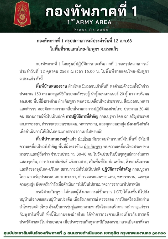 กองทัพภาคที่ 1 โดยศูนย์ปฏิบัติการกองทัพภาคที่ 1 ขอสรุปสถานการณ์ประจำวันที่ 12 ตุลาคม 2568 ณ เวลา 15.00 น. ในพื้นที่ชายแดนไทย-กัมพูชา จ.สระแก้ว ดังนี้