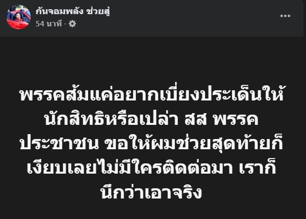 ขณะที่ล่าสุด กัน จอมพลัง โพสต์ เฟซบุ๊ก ระบุว่า พรรคส้มแค่อยากเบี่ยงประเด็นให้นักสิทธิฯหรือเปล่า สส. พรรคประชาชน ขอให้ผมช่วยสุดท้ายก็เงียบเลยไม่มีใครติดต่อมา เราก็นึกว่าเอาจริง