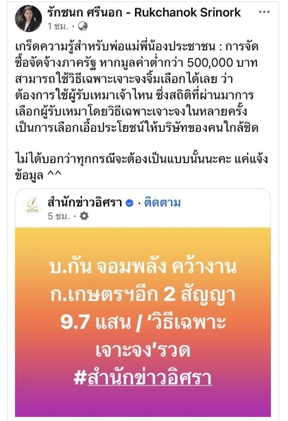 โดย ไอซ์ ระบุข้อความว่า "เกร็ดความรู้สำหรับพ่อแม่พี่น้องประชาชน : การจัดซื้อจัดจ้างภาครัฐ หากมูลค่าต่ำกว่า 500,000 บาท สามารถใช้วิธีเฉพาะเจาะจงจิ้มเลือกได้เลยว่าต้องการใช้ผู้รับเหมาเจ้าไหน ซึ่งสถิติที่ผ่านมาการเลือกผู้รับเหมาโดยวิธีเฉพาะเจาะจงในหลายครั้งเป็นการเลือกเอื้อประโยชน์ให้บริษัทของคนใกล้ชิด