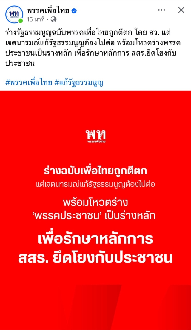 เมื่อวันที่ 15 ต.ค. ผู้สื่อข่าวรายงานว่า เพจเฟซบุ๊กพรรคเพื่อไทย โพสต์ข้อความภายหลัง ร่างแก้ไขรัฐธรรมนูญฉบับพรรคเพื่อไทยถูกตีตก โดยระบุว่า “ร่างฉบับเพื่อไทยถูกตีตก แต่เจตนารมณ์แก้รัฐธรรมนูญต้องไปต่อ พร้อมโหวตร่างพรรคประชาชนเป็นร่างหลัก เพื่อรักษาหลักการ ส.ส.ร. ยึดโยงกับประชาชน”