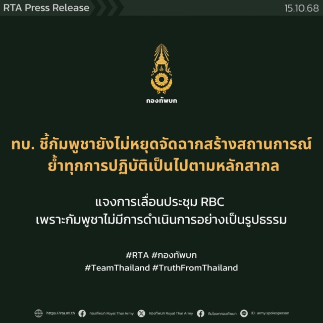 ทั้งนี้ กองทัพบก ยืนยันในการร่วมขับเคลื่อนทุกมาตรการภายใต้กรอบความร่วมมือ GBC และขอเรียกร้องให้ฝ่ายกัมพูชาแสดงความจริงใจในการดำเนินการร่วมกันอย่างเป็นรูปธรรม เพื่อให้เกิดประโยชน์สูงสุดต่อทั้งสองประเทศ อันจะนำไปสู่การแก้ไขปัญหาอย่างยั่งยืนในอนาคต