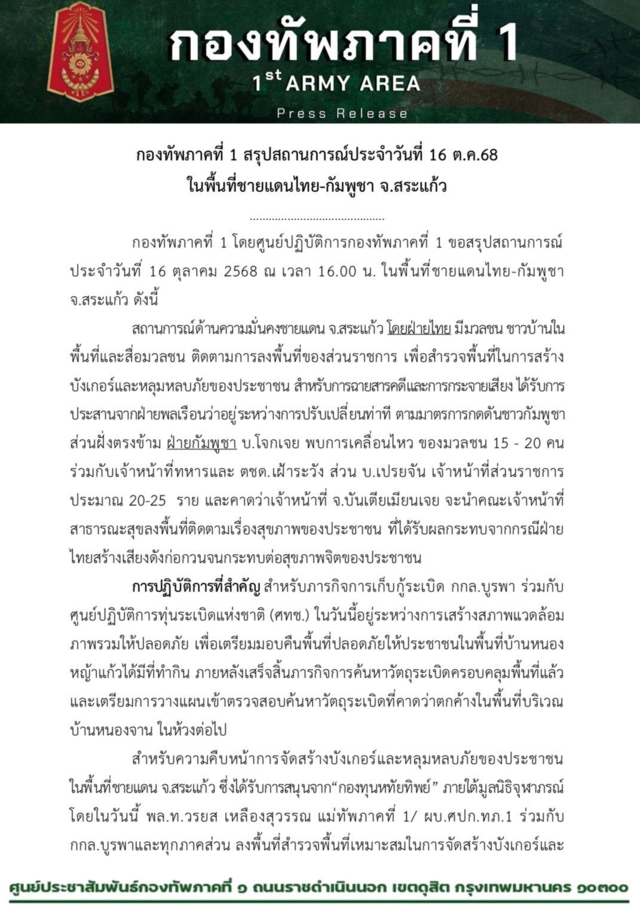 กองทัพภาคที่ 1 โดยศูนย์ปฏิบัติการกองทัพภาคที่ 1 ขอสรุปสถานการณ์ประจำวันที่ 16 ตุลาคม 2568 ณ เวลา 16.00 น. ในพื้นที่ชายแดนไทย-กัมพูชา จ.สระแก้ว ดังนี้