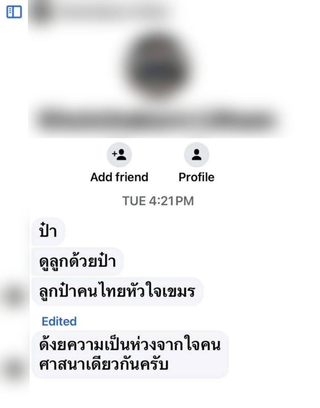 พร้อมกับแนบแชตข้อความของบุคคลๆหนึ่ง ที่ได้แชตมาหาคนในครอบครัวของเธอ โดยชายคนดังกล่าว แชตมาว่า ป๋าดูลูกด้วยป๋า ลูกป๋าคนไทยหัวใจเขมร ด้วยความเป็นห่วงจากใจคนศาสนาเดียวกันครับ