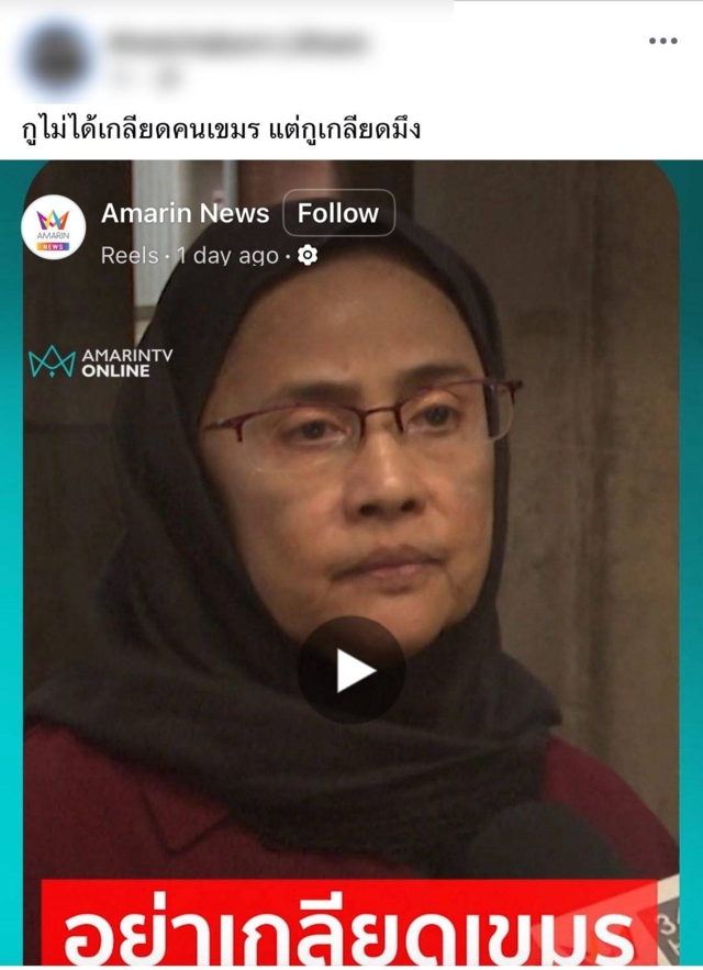 นอกจากนี้ชายคนดังกล่าวยังแชร์คลิปข่าวของนางอังคณา พร้อมระบุ แคปชั่นว่า "กูไม่ได้เกลียดคนเขมร แต่กูเกลียดมึง"