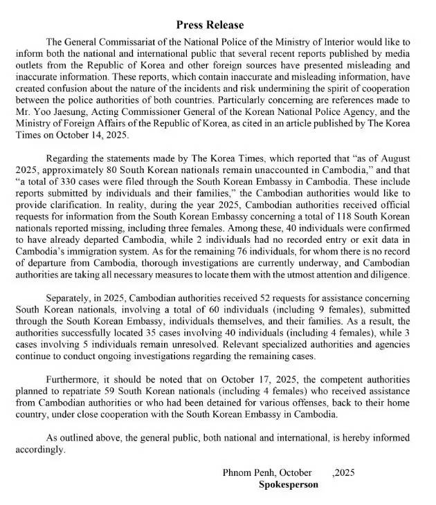 แถลงการณ์ของเดอะโคเรียไทมส์ ซึ่งรายงานว่า "ณ เดือนสิงหาคม พ.ศ. 2568 มีชาวเกาหลีใต้ประมาณ 80 คนยังคงสูญหายในกัมพูชา" และ "มีการยื่นเรื่องผ่านสถานทูตเกาหลีใต้ประจำกัมพูชาทั้งหมด 330 คดี ซึ่งรวมถึงรายงานที่บุคคลและครอบครัวยื่น" ทางการกัมพูชาขอชี้แจง ในความเป็นจริง ในปี พ.ศ. 2568 ทางการกัมพูชาได้รับคำขอข้อมูลจากสถานทูตเกาหลีใต้อย่างเป็นทางการเกี่ยวกับชาวเกาหลีใต้ที่สูญหายทั้งหมด 118 คน ซึ่งรวมถึงผู้หญิง 3 คน ในจำนวนนี้ 40 คนได้รับการยืนยันว่าเดินทางออกจากกัมพูชาแล้ว ขณะที่ 2 คนไม่มีข้อมูลการเข้า-ออกในระบบตรวจคนเข้าเมืองของกัมพูชา ส่วนอีก 76 คนที่เหลือ ซึ่งไม่มีบันทึกการเดินทางออกจากกัมพูชา ขณะนี้กำลังดำเนินการสืบสวนอย่างละเอียด และทางการกัมพูชากำลังดำเนินมาตรการที่จำเป็นทั้งหมดเพื่อค้นหาพวกเขาด้วยความเอาใจใส่และความระมัดระวังอย่างที่สุด